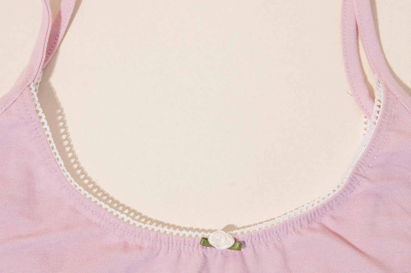 Our scoop back camisole is designed to make an effortless transition from loungewear to a casual going out look. Our signature soft, breathable cotton provides comfortable support for every bust size and cropped hem shows just the right amount of tummy. The deep scoop back is the cherry on top. Each tank top features lace trim and a satin rosebud at the center. Pair with high waisted jeans and a unbuttoned flannel for a cute summer look.