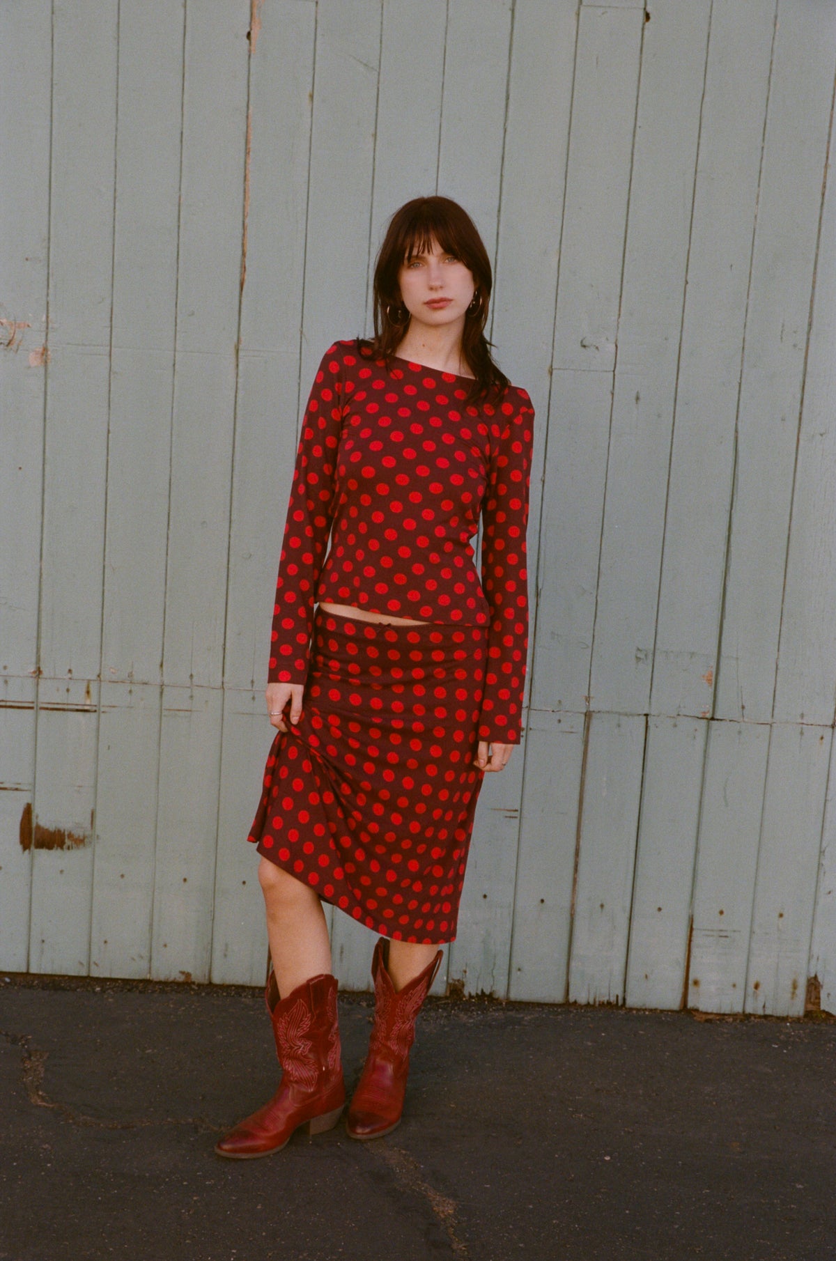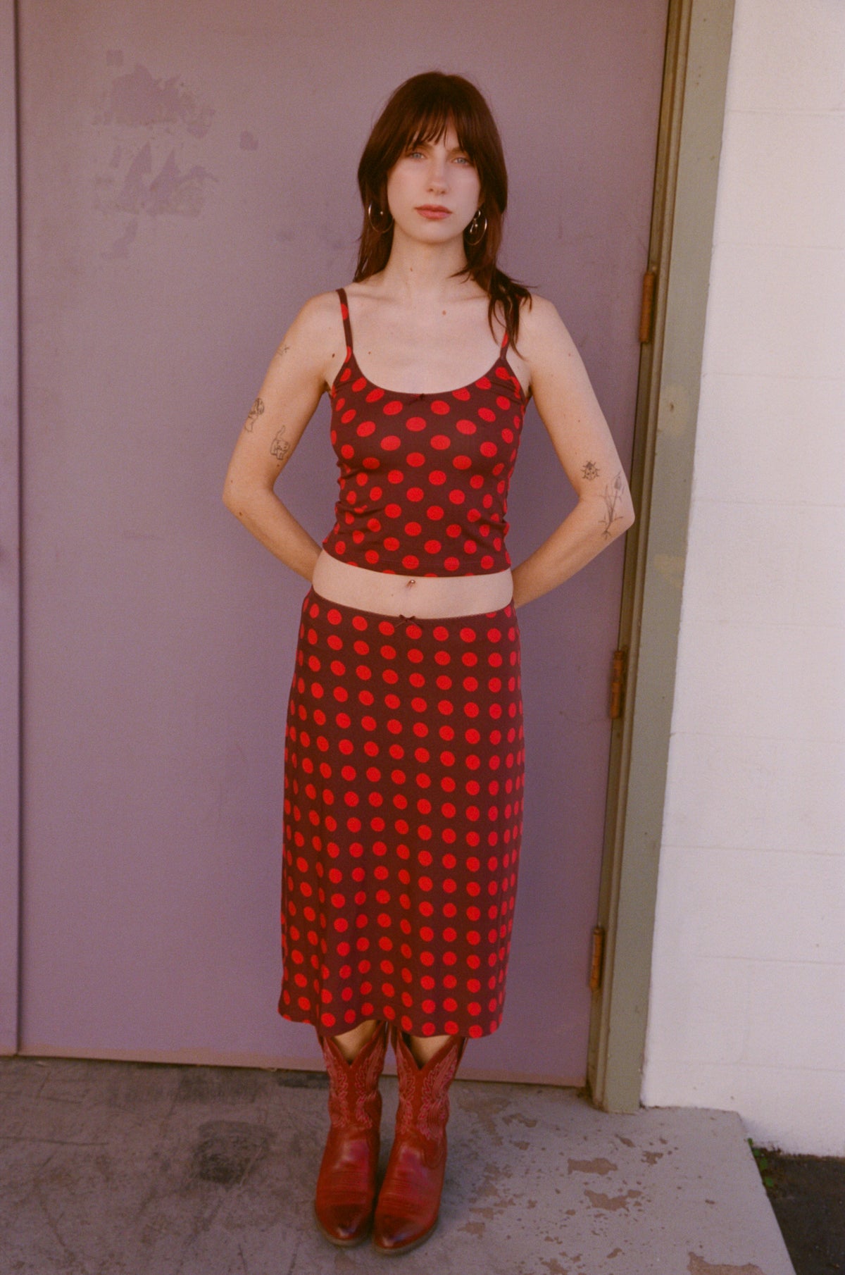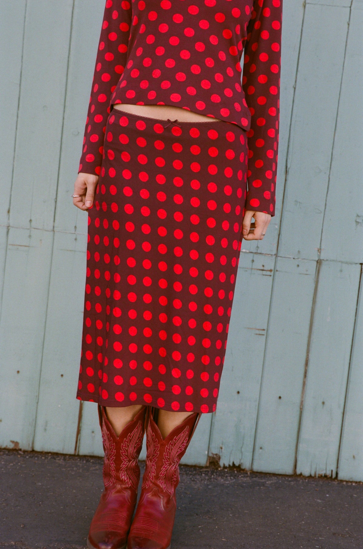 Bias midi slip skirt in scarlet dot