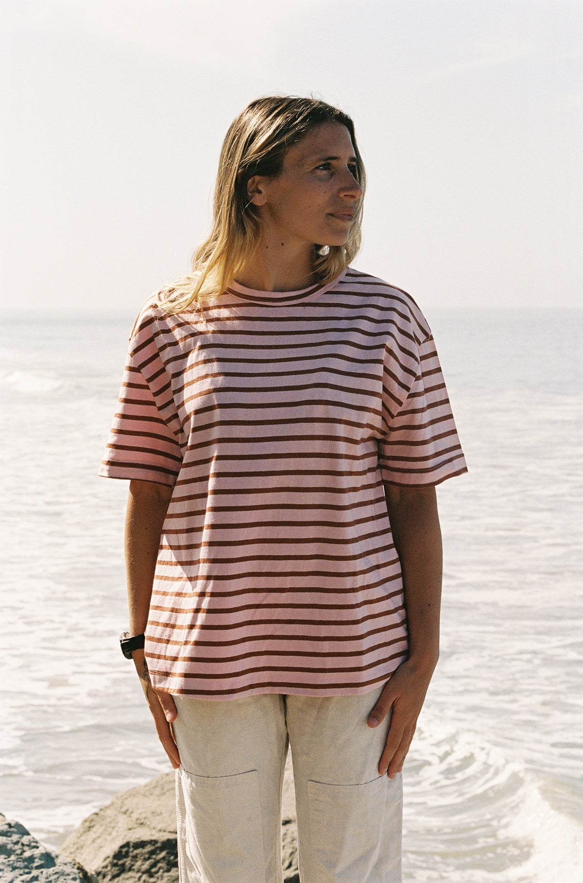 Oversized boifriend t-shirt in mocha stripe