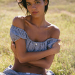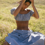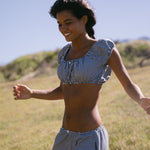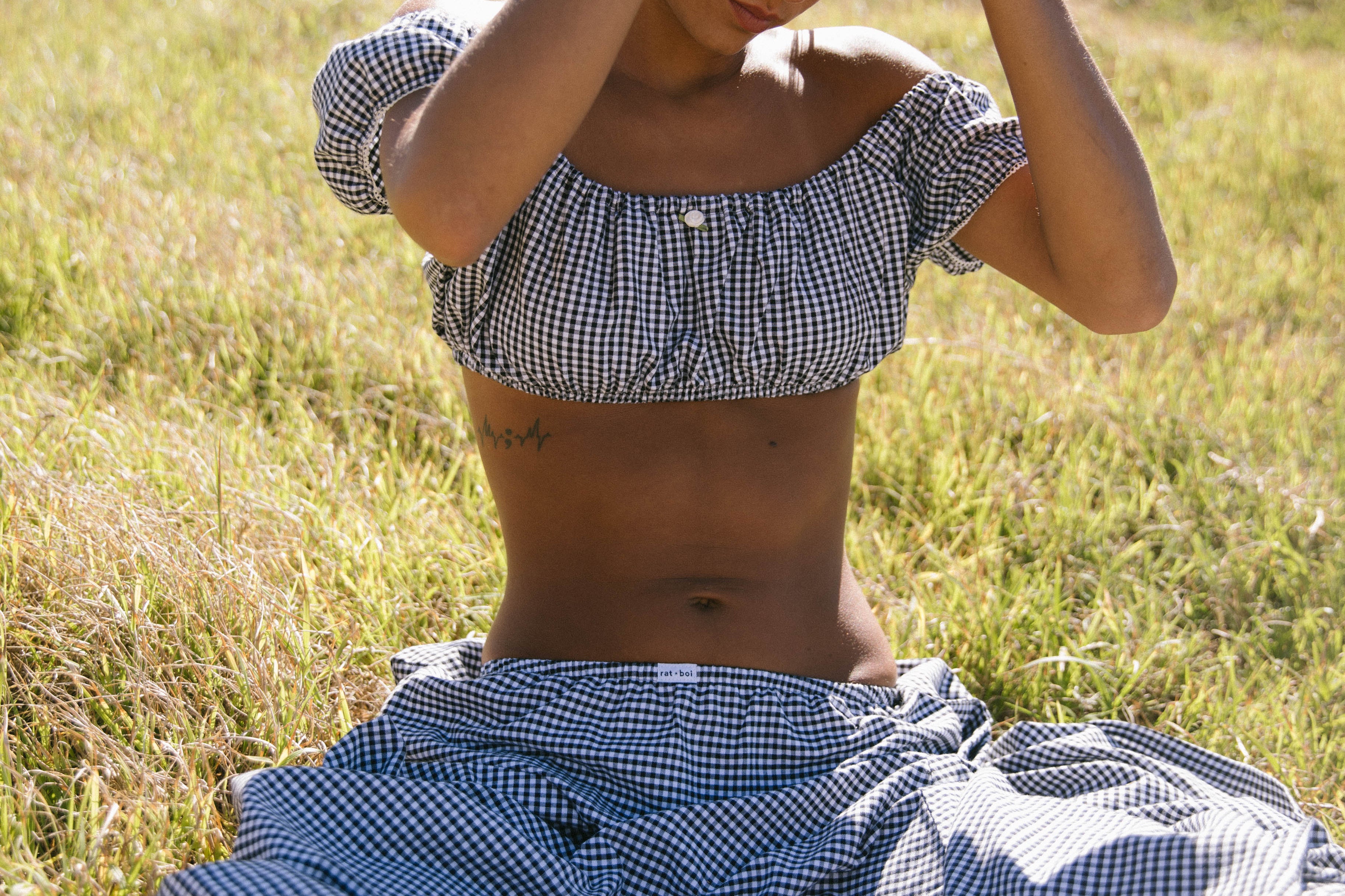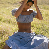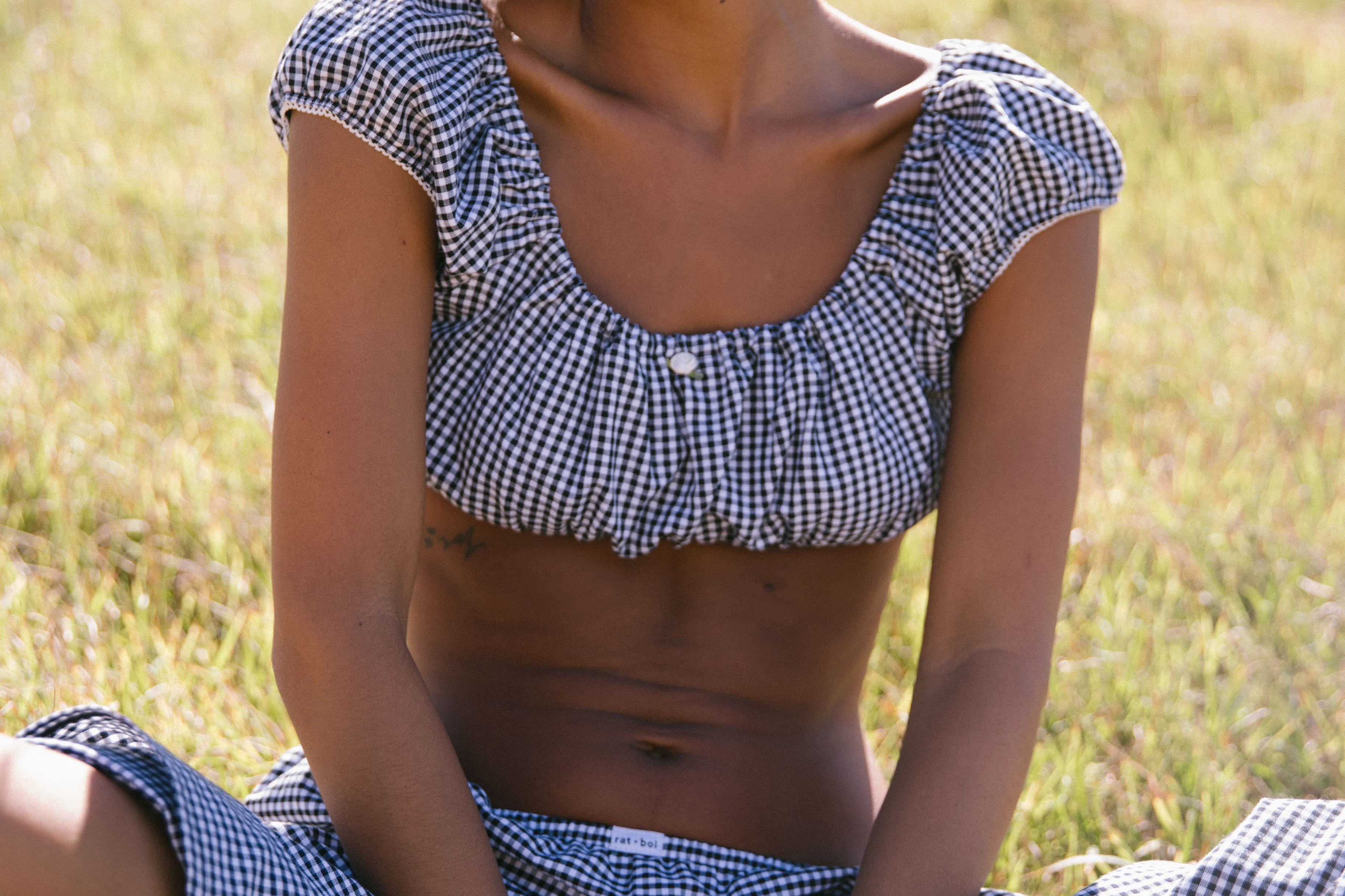 Our babydoll top was designed to be paired with your dream skirt, however it looks great with our ruffle capri or your favorite pair of denim. Babydoll tops are made from high quality, breezy cotton that’s both breathable and comfortable. The gathered neckline can be worn on or off the shoulders, while the waistline sits just under the bust like a bra. It features our rat boi signature lace trim and satin rose at center front. Layer with your favorite swim or pair with ankle socks and a baseball cap for an effortless everyday look. Each babydoll top is sewn by our family run factory in LA.