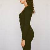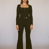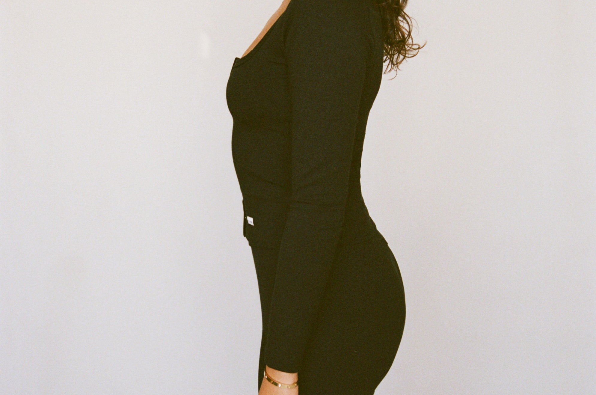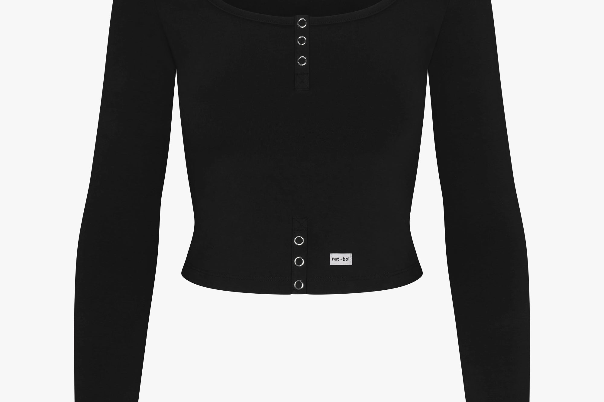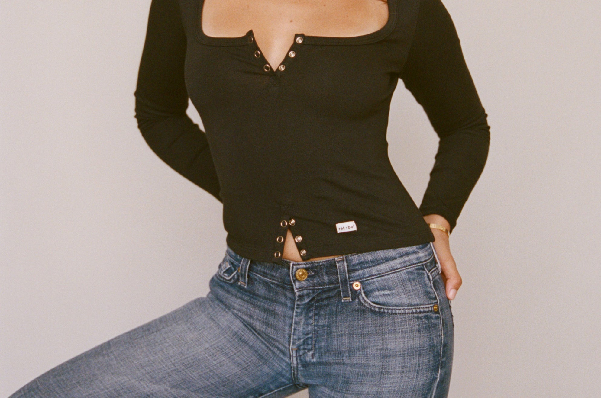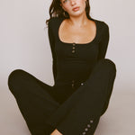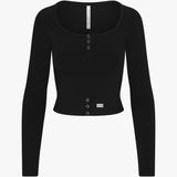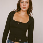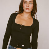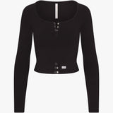 A fitted mid-length long sleeve top made with a soft enzyme washed cotton. Designed with a scoop square neckline and cozy long sleeves. Each top features six functional snaps with three at the chest and three at the hem that can be worn open or closed. Easy to pair with the Butterfly Snap Pant or style on its own.