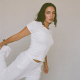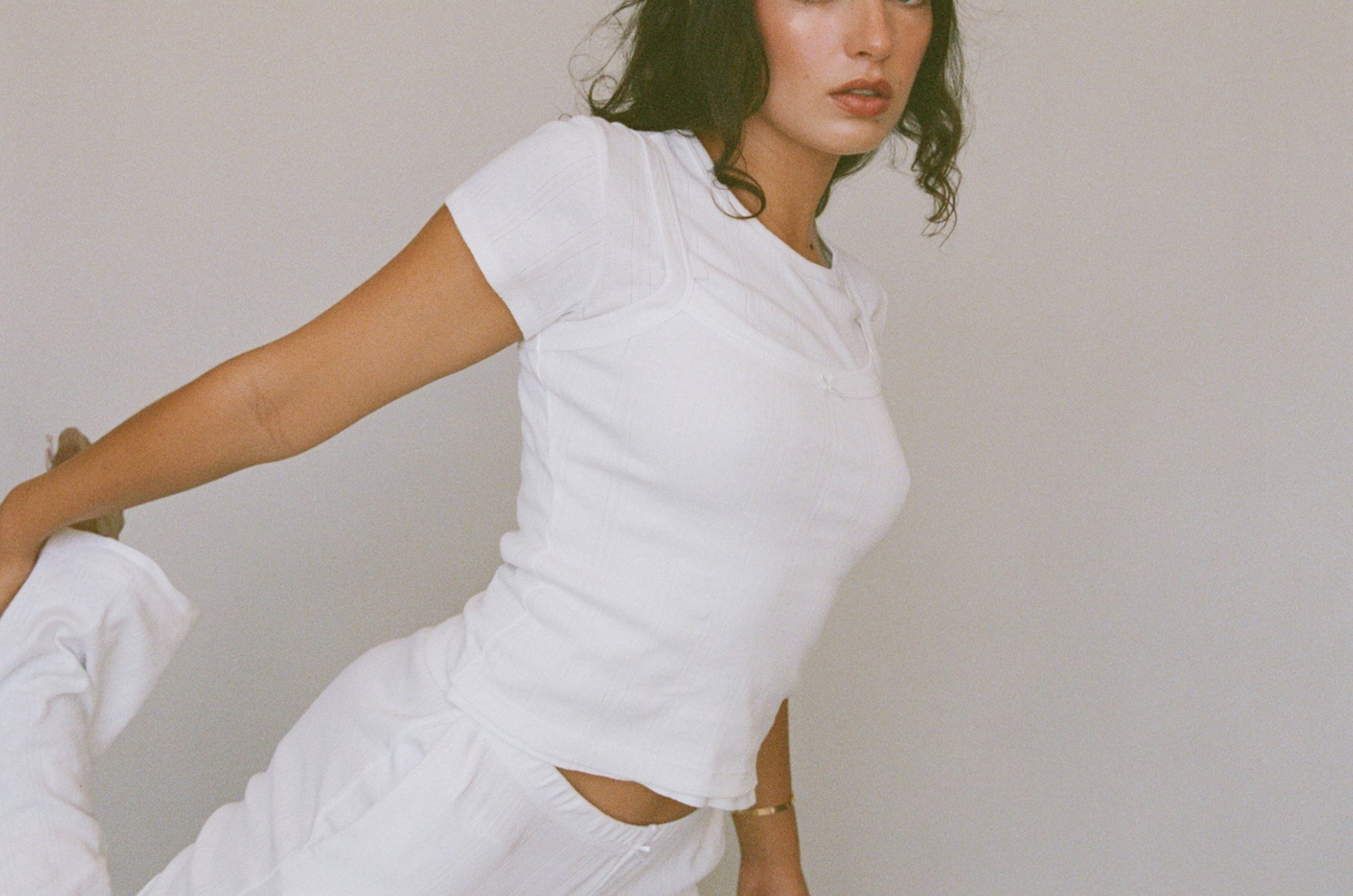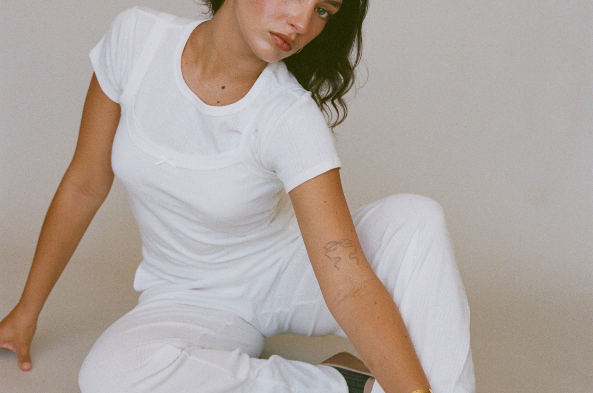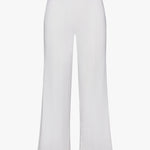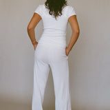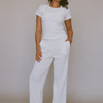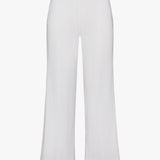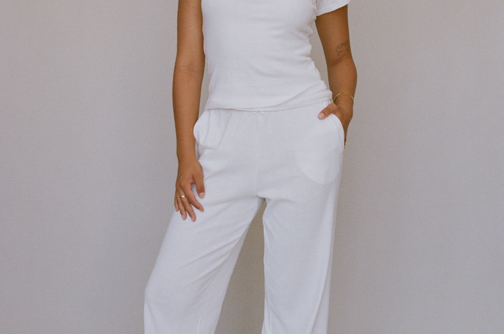 A high rise lounge pant made from 100% organic cotton pointelle with a soft breathable feel. Knitted and sewn in Los Angeles for a fully LA-made piece. Designed with a full length leg and a slightly flared opening for an easy drape. Cut with a flattering tailored shape that feels polished enough to wear out yet relaxed enough for home. Finished with side pockets for everyday ease. Please note: the Swan color way is slightly sheer.