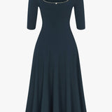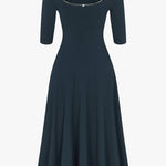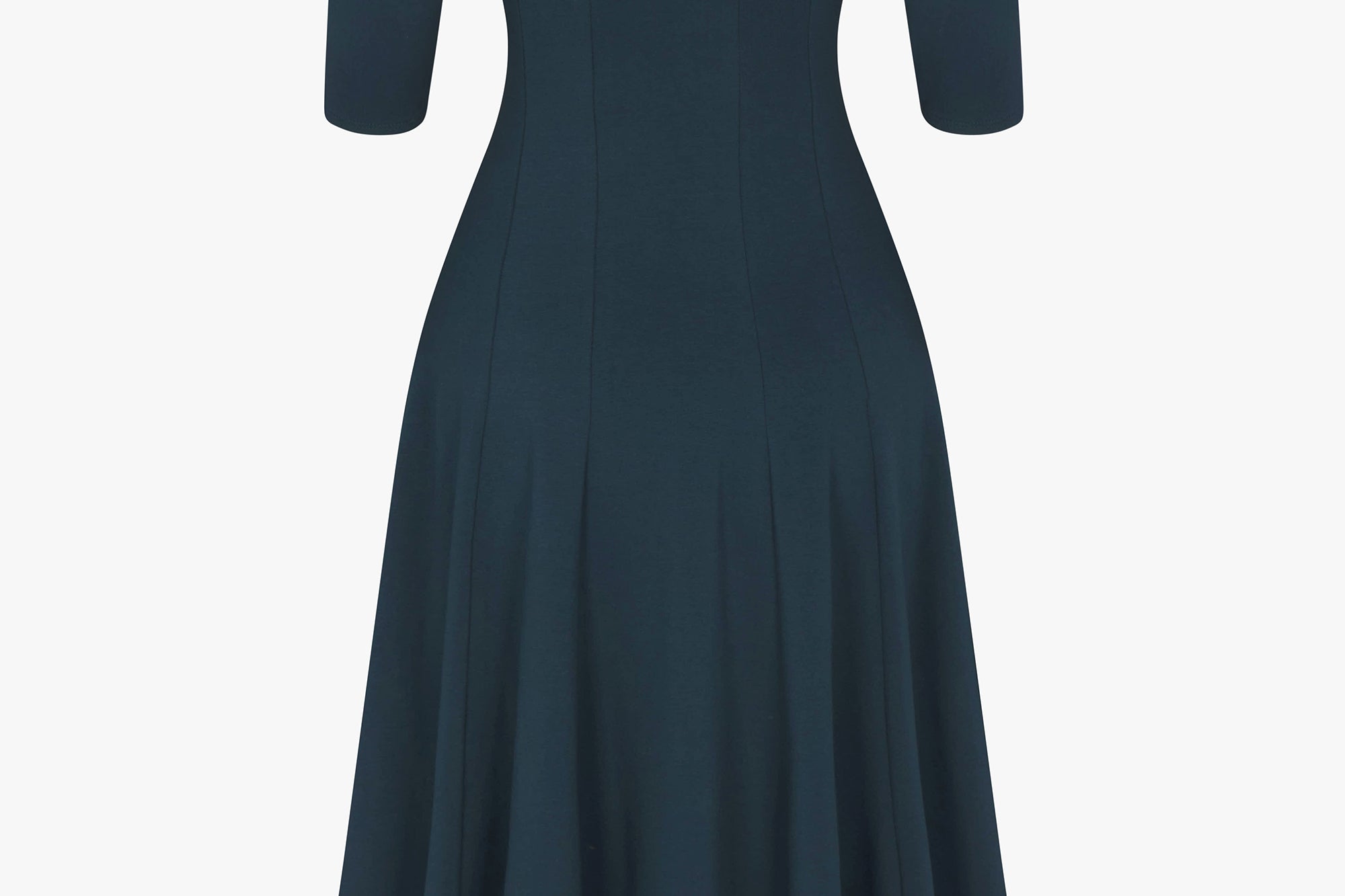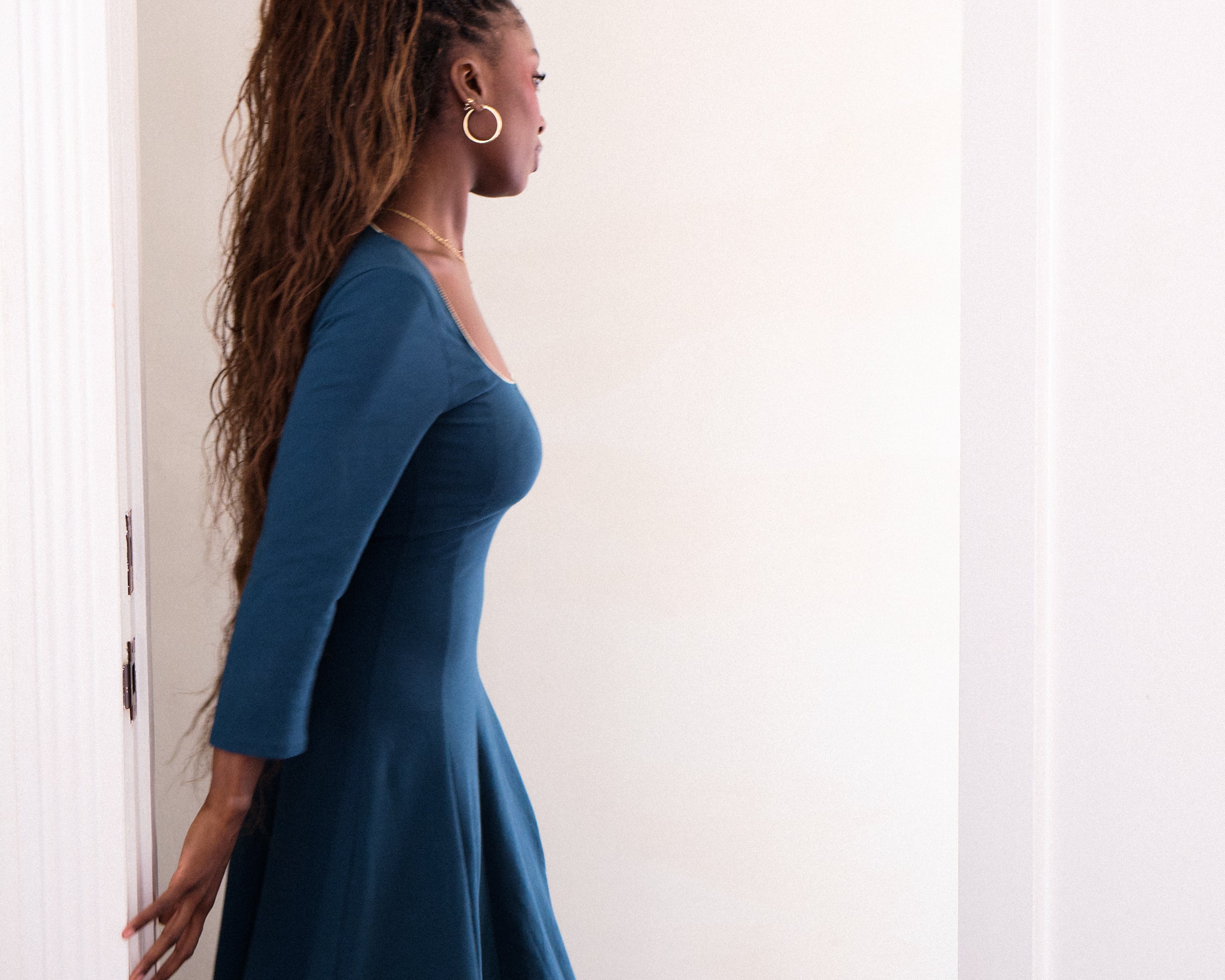 The deep square scoop neckline flatters the collarbone, while sizes 2X and 3X have a slightly higher cut for added support without altering the shape. Fitted through the bust and ribcage, it flares gently from the waist for a feminine drape that falls just below the calf. Supportive, curve-hugging, and maternity-friendly, it’s a versatile piece that transitions seamlessly from day to night.