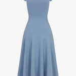 - Flared, mid-length skirt