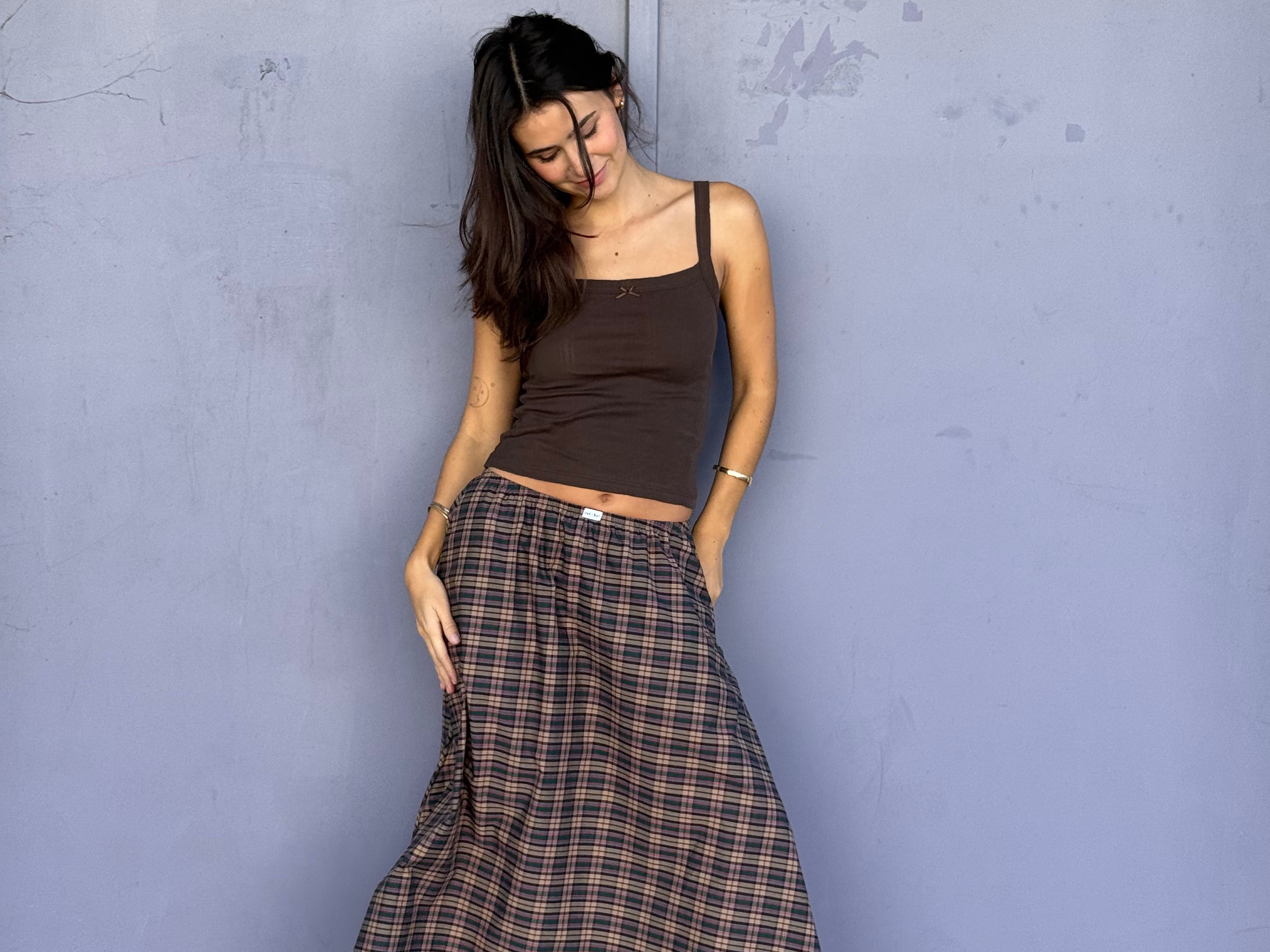 The Dream Skirt is an ankle-length style made from over two yards of lightweight, breathable 100% woven cotton. Designed with an elastic waistband, side seam pockets, and a-line skirt, it drapes beautifully to create a flattering silhouette on every body. Wear it high at the waist for a classic look, or lower on the hips for a relaxed fit. Effortless and versatile, it’s easy to dress up or down with a scoop back cami. Ethically made in Los Angeles.