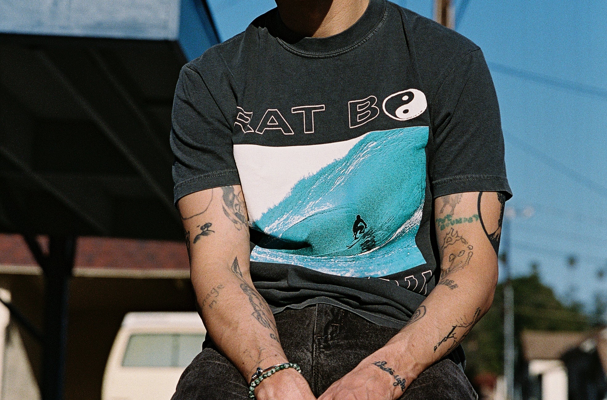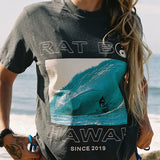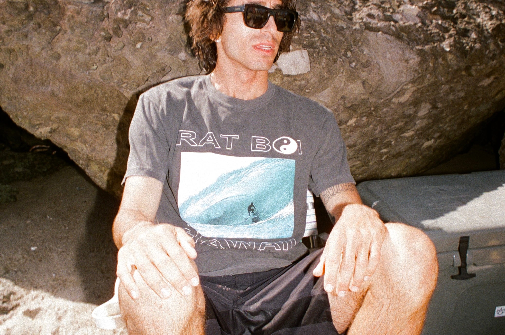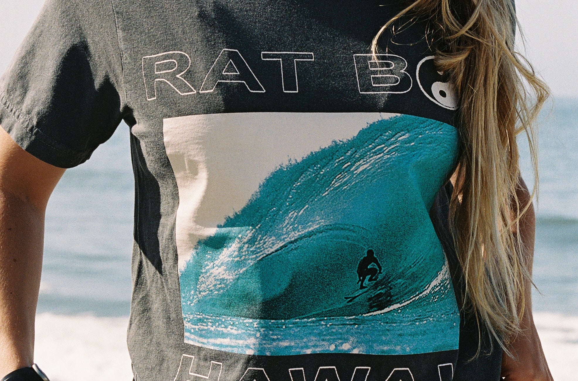 Our RAT BOI surf collection is inspired by the vintage t-shirts Alexa grew up wearing in her hometown of Makaha, HI. Featuring photography by renowned California surf photographer Woody Woodworth, whose work has appeared in Surfer Magazine and over 40 other surf publications, the collection pays homage to the iconic Pipeline break.
