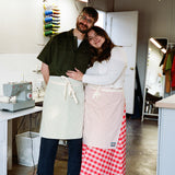 A knee-length apron designed for bakers, home cooks, and makers who like to keep things tidy. Made from 100% cotton, the apron is fully reversible and features a pocket on the main side to hold your tools. The 43" canvas straps are long enough to wrap around the body and tie in the front for a secure, adjustable fit. The apron is pictured on Justin and his partner Sky, who is a pastry chef, and who inspired the design and functions of the apron. Each apron is handmade in collaboration with Dansby in his Ventura, CA studio.