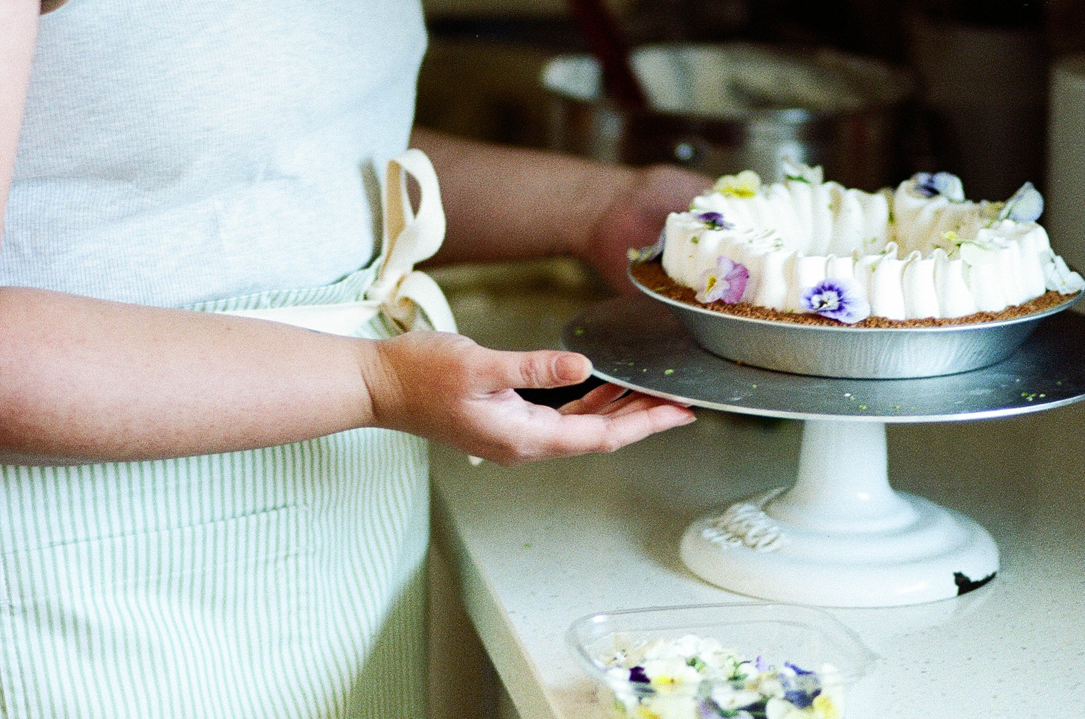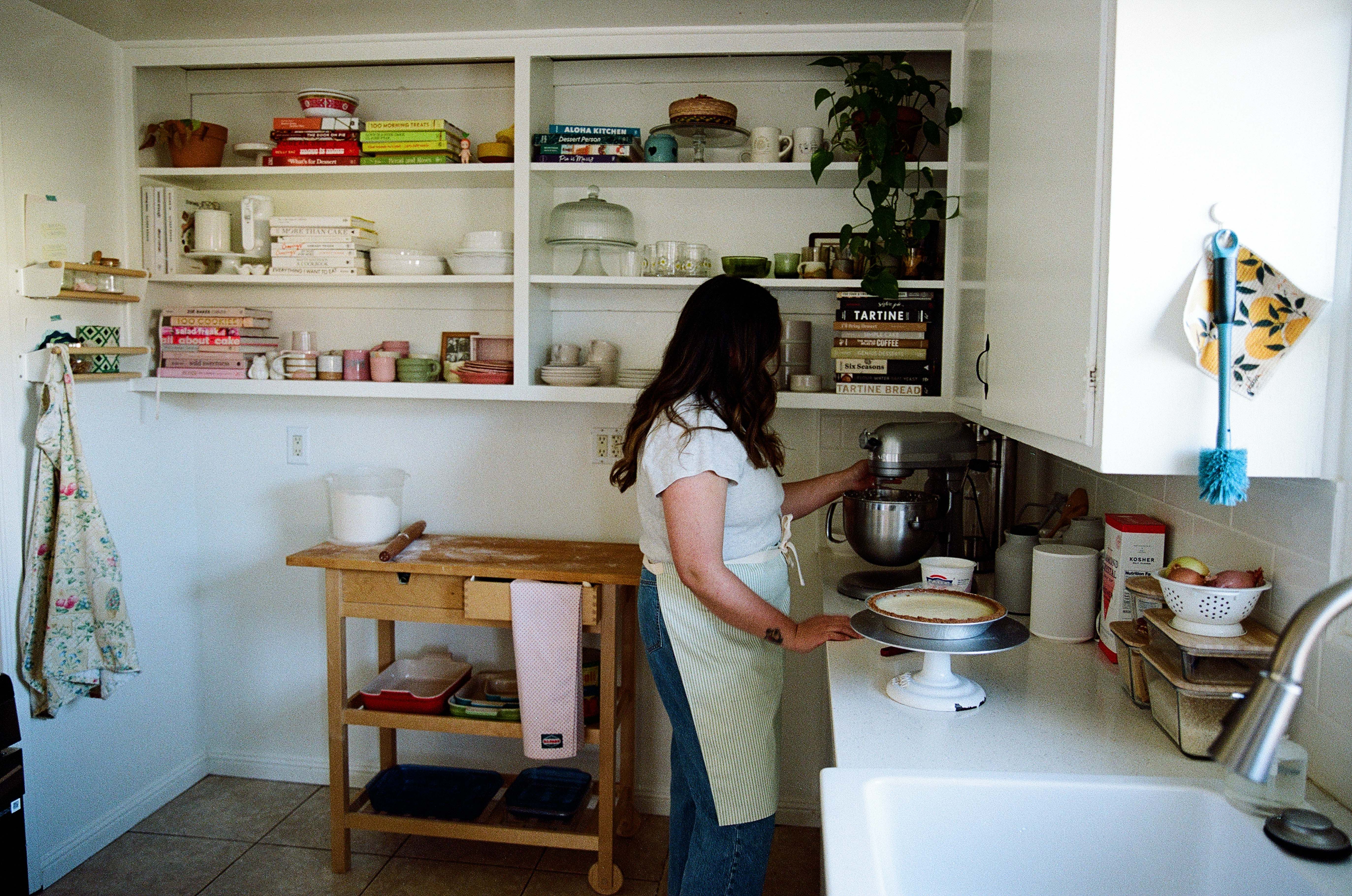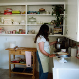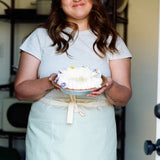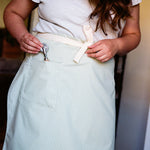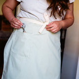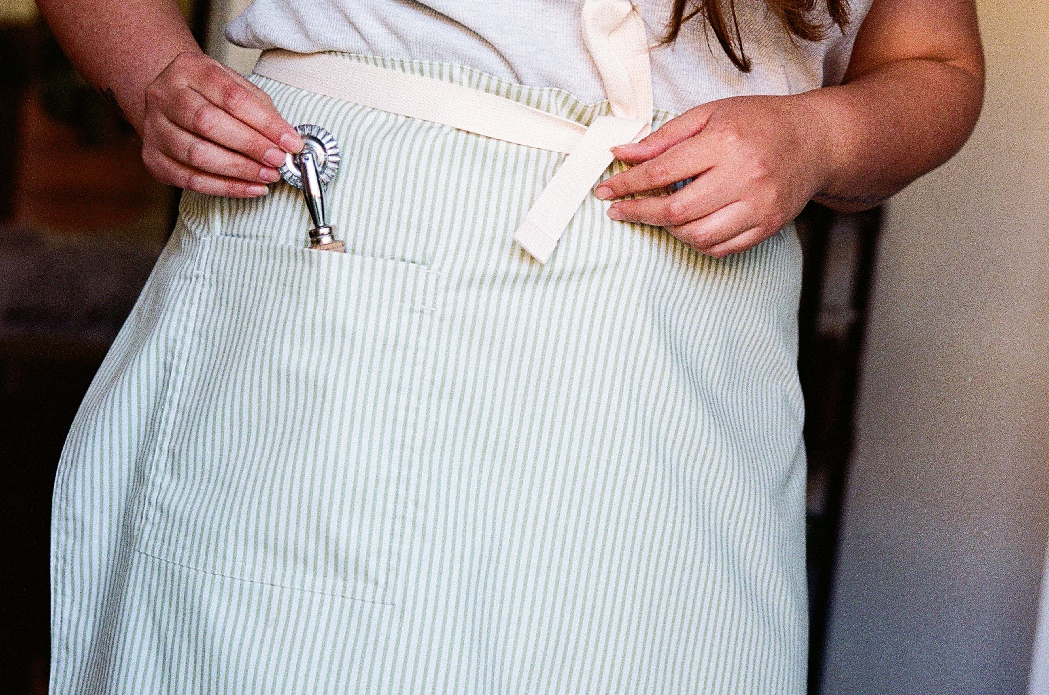 Sky is a pastry chef, and contributed to the thoughtful details that make this baker's apron perfect. The length protects from the heat of the oven, the colors hide flour easily, and the pocket fits all the tools you need.