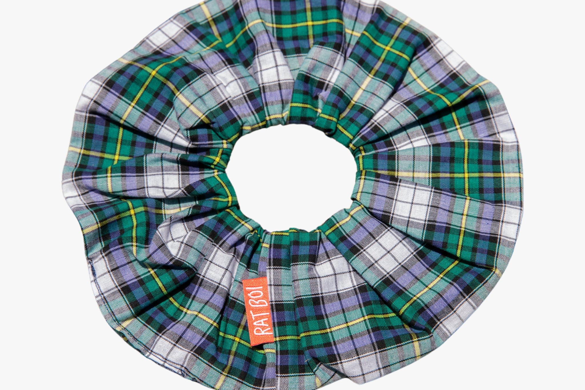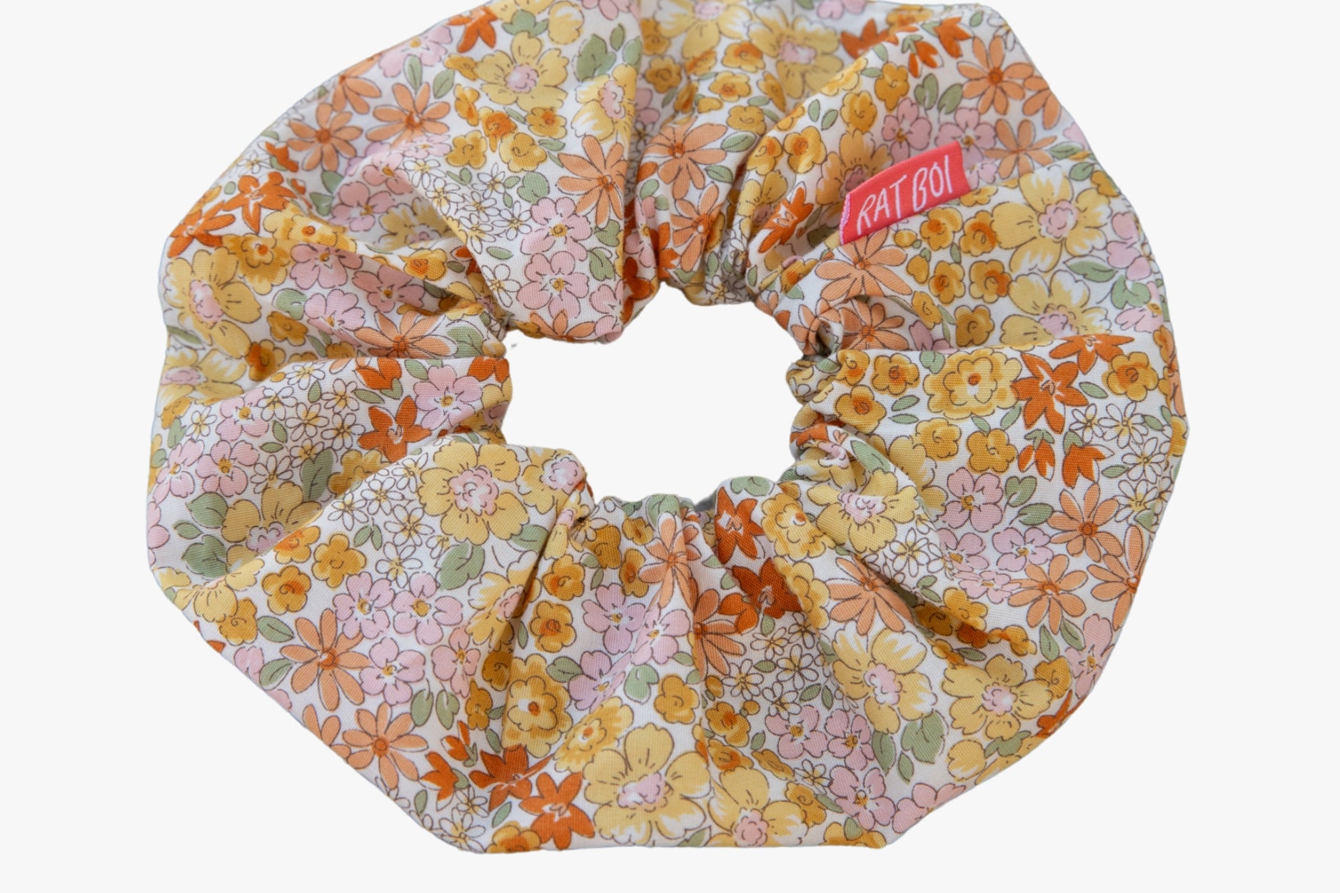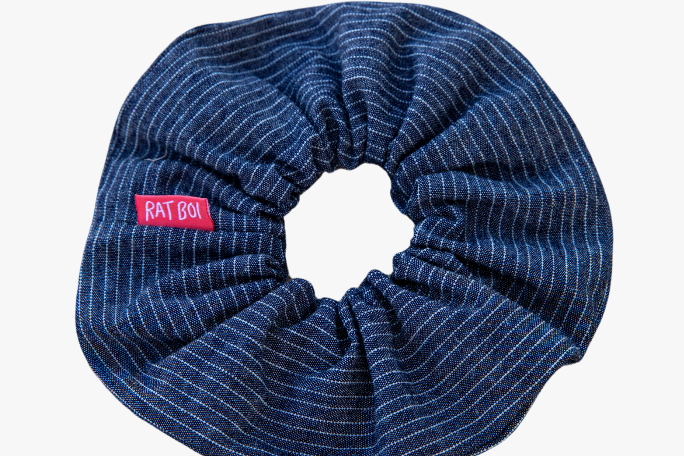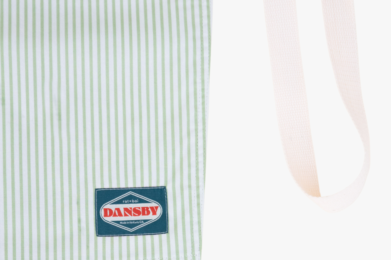 Dansby is a sustainable clothing brand created by our friend Justin and named after one of his cats. Inspired by his years in the service industry, Justin designs with utility and style in mind—clothing you can wear through a shift and straight to happy hour with friends. His partner, Sky, a pastry chef, contributed to the thoughtful details that make this baker's apron perfect. This collaboration features RAT BOI-sourced fabric, Justin's signature half apron design, and a matching RAT BOI scrunchie—a hallmark of our brand.