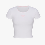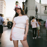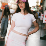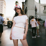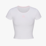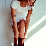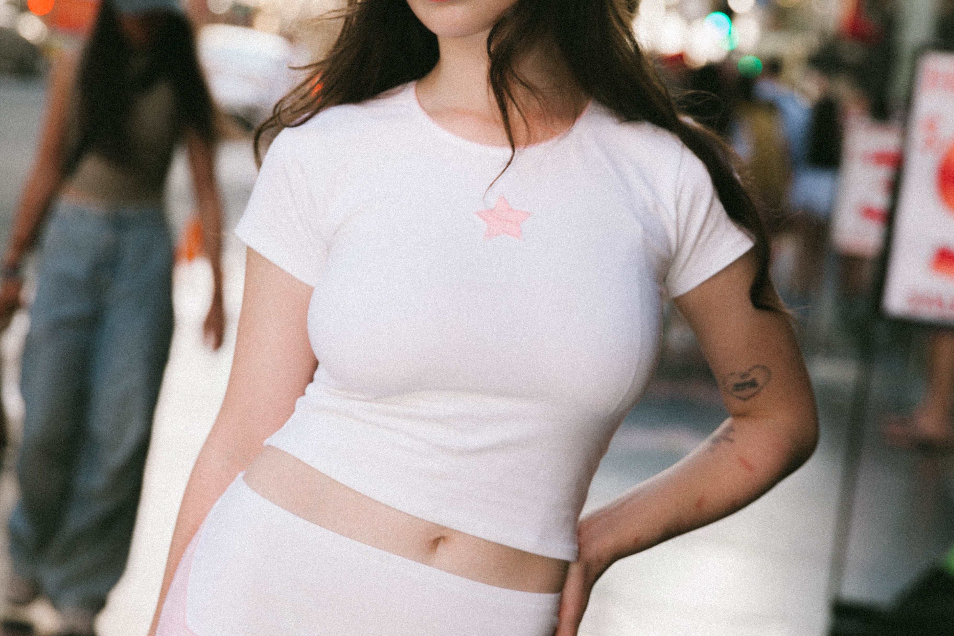 Our stargirl collection is inspired by the 90s grunge era in LA on sunset strip. Our baby tee is form fitting and features contrasting lace at the neck and an appliquéd star at the center front. The stargirl baby tee can be worn as a set but also mixes and matches oh so well with other basics you have in your wardrobe.
