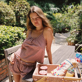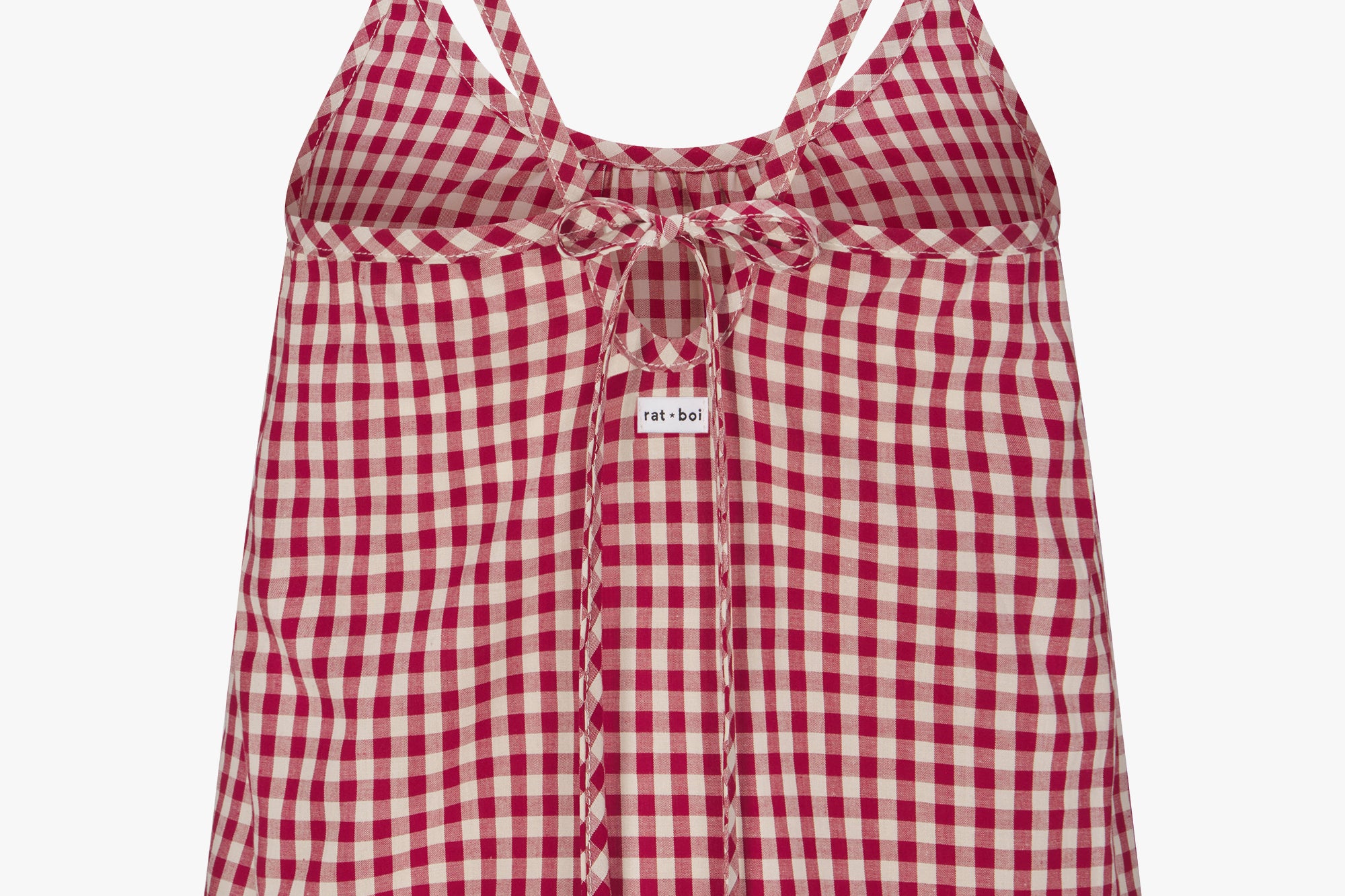 Our new favorite cami, designed with a soft, gathered neckline and an open keyhole back. Made from lightweight cotton gingham, it features delicate spaghetti straps and an adjustable tie for the perfect fit. Finished with a subtle RAT BOI label just below the keyhole. Wear it with our Easy Bloomer Shorts or Dream Skirt for an effortless summer look.
